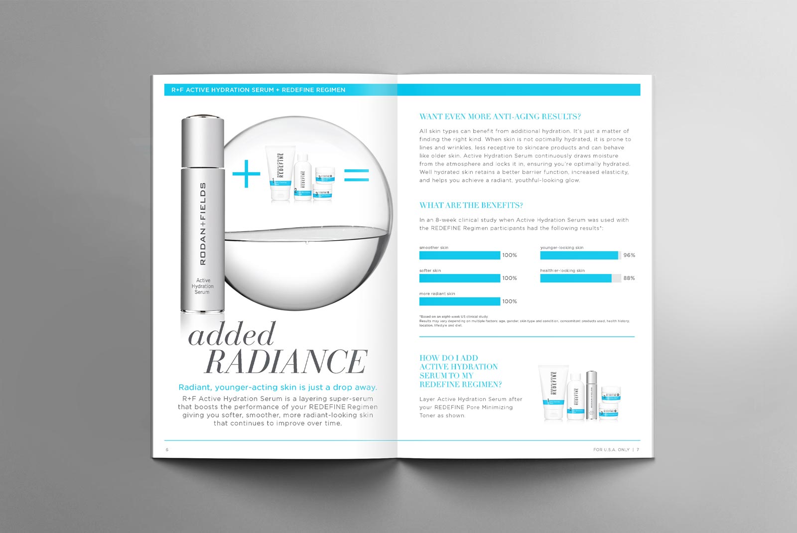 “Active Hydration Serum is a lightweight super-serum that has been clinically tested to boost R+F Regimen performance by adding additional benefits. It is oil-free, non-comedogenic (won’t clog pores) and has been clinically tested for all skin types.”