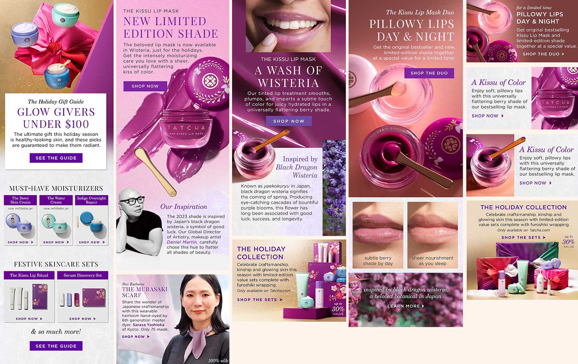 Multi-phase email campaign highlighting the holiday collection and limited edition items, such as this year's Kissu Lip Mask tint.